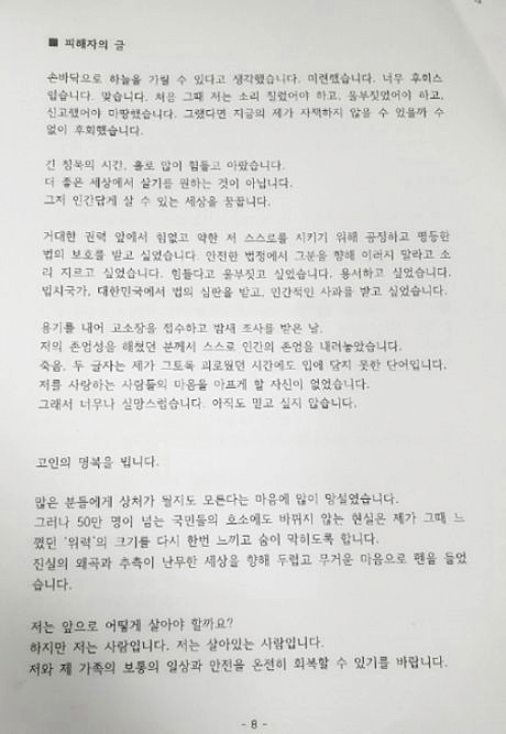 용기를 내어 고소장을 접수하고 밤새 조사를 받은 날, 저의 존엄성을 해쳤던 분께서 스스로 인간의 존엄을 내려놓았습니다. 죽음, 두 글자는 제가 그토록 괴로웠던 시간에도 입에 담지 못한 단어입니다. 저를 사랑하는 사람들의 마음을 아프게 할 자신이 없었습니다. 그래서 너무나 실망스럽습니다. 아직도 믿고 싶지 않습니다.